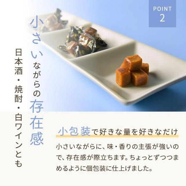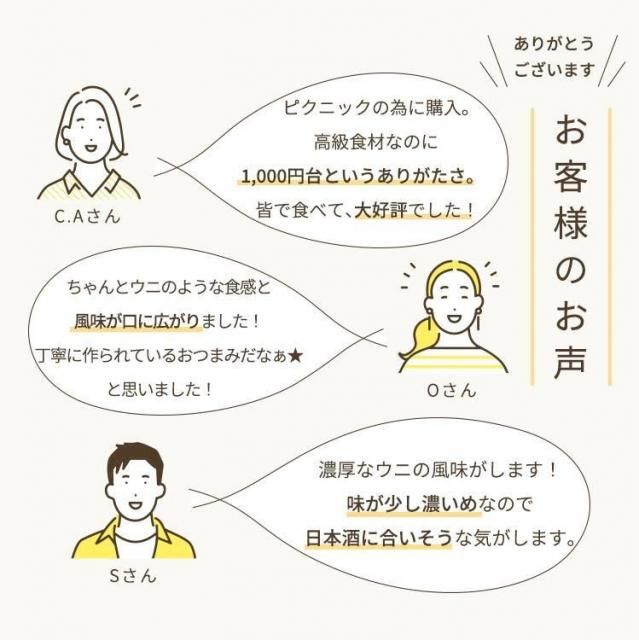 濃厚な"うに"の旨味と磯の香りが口いっぱいに広がり、旨味たっぷりの小さなウニ珍味。ひとくちサイズびキャンディー包装なので、ちょっとしたおつまみに最適です。