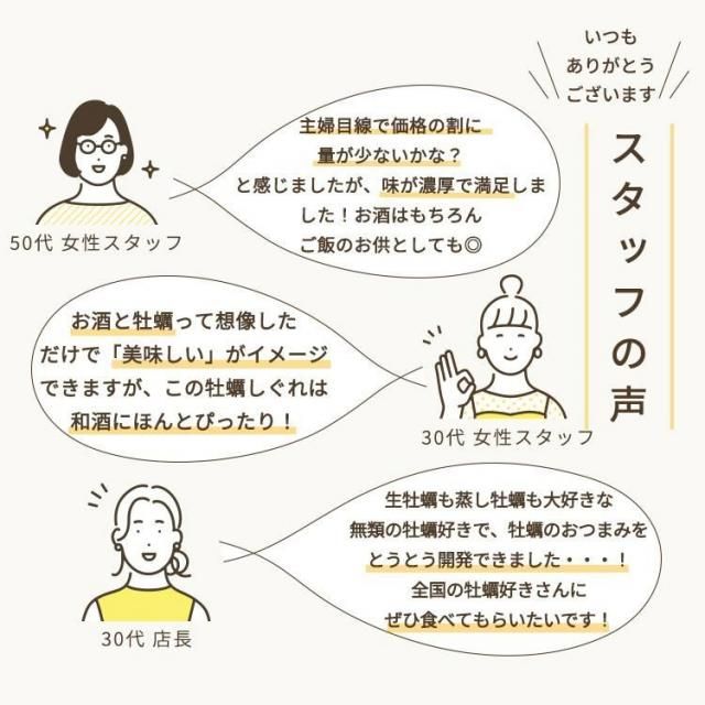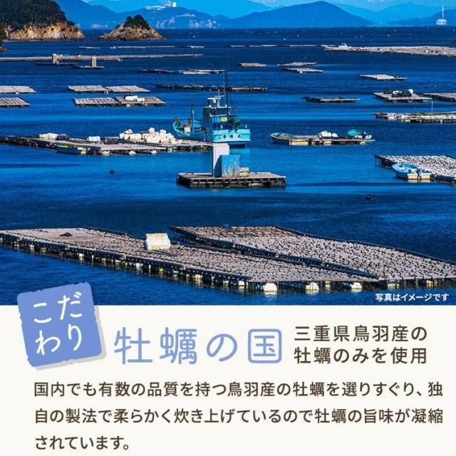 三重県鳥羽産の牡蠣のみを使用。国内でも有数の品質を持つ、鳥羽産の牡蠣を選りすぐり、独自の製法で柔らかく炊き上げているので、牡蠣の旨味が凝縮されています。