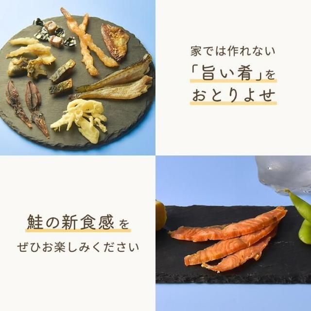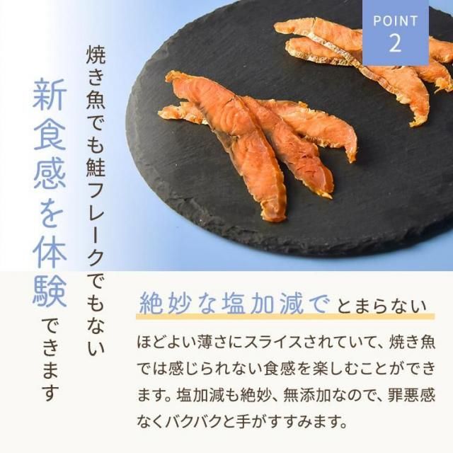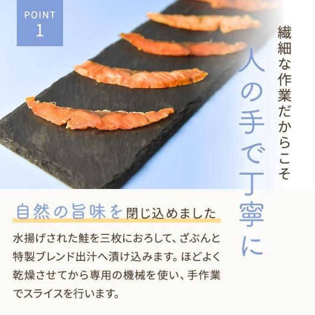 まるで食卓に出てくるかのような鮭ですが、しっかり乾燥させたあと、程よい薄さにカットしているので焼き魚では感じられない食感を体験することができます。