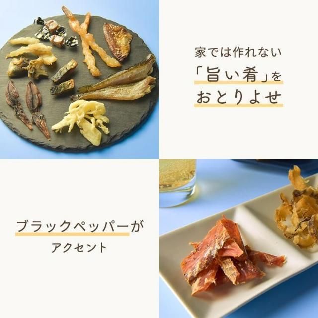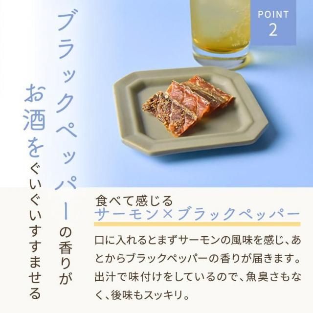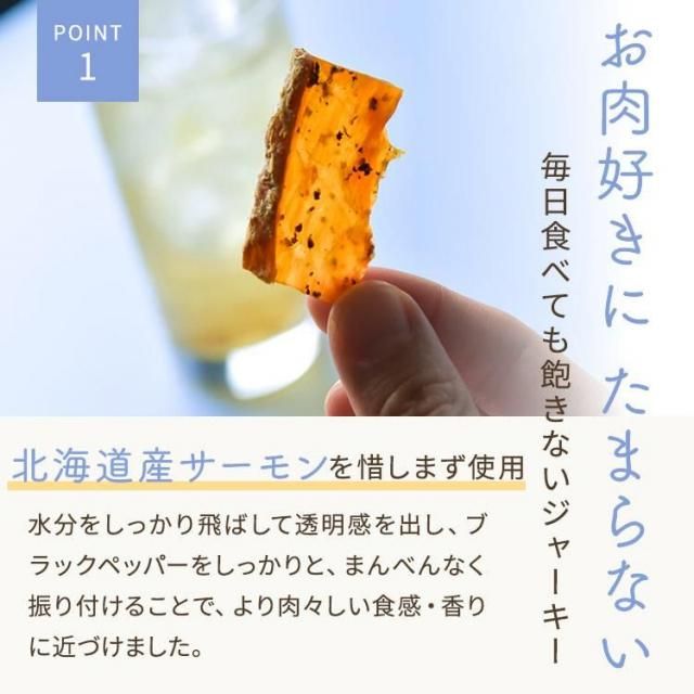 噛み応えのある肉厚なサーモンを乾燥させ、ブラックペッパーをしっかりとまんべんなく振り付けることで、より肉肉しい食感に近づけました。