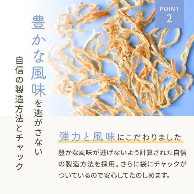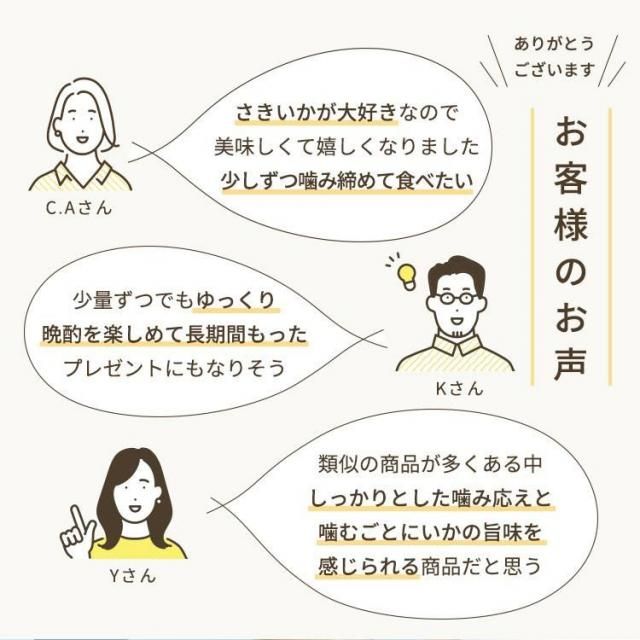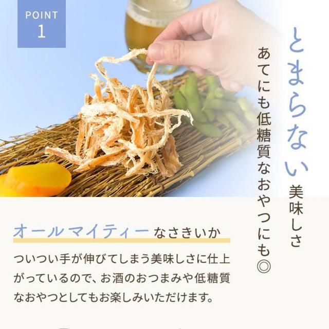 【容量にもこだわりあり!】2~3度で食べきることができる程よいボリュームですので、チャック付きでなくても、風味が落ちない頃に1パックが無くなります。もちろん、するめさきいかは業務用としてもお使いいただける満足のいく容量になっているので、業務用として使うのもよし、お酒のおつまみで楽しむのもよし、低糖質のお菓子としてもお楽しみいただけます。【高たんぱく、低糖質の優秀なお菓子】魚介類と比較すると低糖質で低カロリーなさきいか!しっかりと噛み応えがあるので、ダイエットにも効果的!しっかりと素材の味も残っているので、食べすぎでも飽きがここず、日常の食事やお菓子と置き換えることもか可能。肉厚のため、普段の炒め物やおかずの食材としてもアクセントをつけることができるので、幅広い年齢層の方に好評いただいております。
