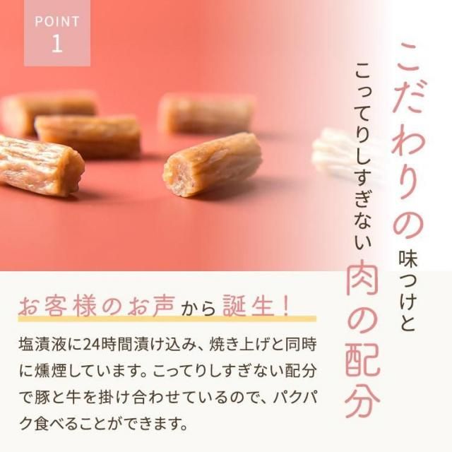 味付けの塩漬液に肉を24時間漬け込み、表面の皮に充填させ、焼き上げと同時に燻煙しています。 こってりなりすぎない配分で豚と牛を掛け合わせているので、パクパク食べることができます。