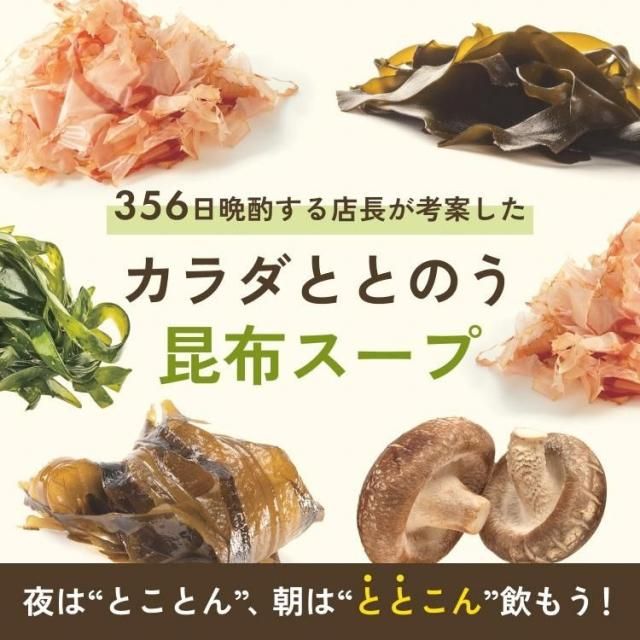 ととこん飲んで、ととのおう!自然の恵みを活かした、かつお節や椎茸の芳醇な出汁に、とろっとろの”がごめ昆布”や”ふんわり白とろろ”に国産昆布、わかめをたっぷ合わせました。色々な楽しみ方もできるので常備スープとして最適です!