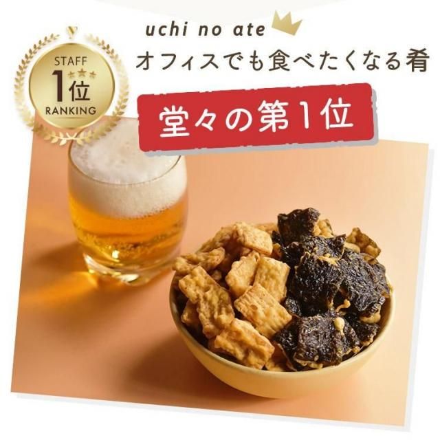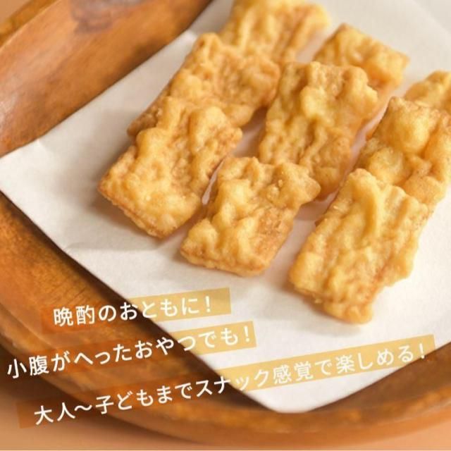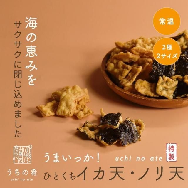 晩酌のお供に!小腹がへったおやつにも。子供〜大人までスナック感覚で楽しめます♪王道のイカ天・ノリ天ですが、uchi no ateの天ぷらスナックはひと味違います♪パクパク食べれるよう、イカ・油にもこだわり、ひとくちサイズに。