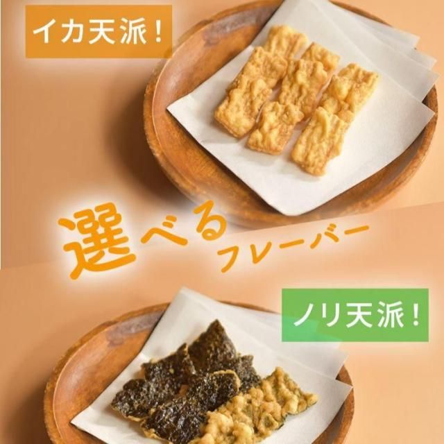 【原材料】●イカ天:イカシート(イカ、魚肉、還元水あめ、その他)(国内製造)、植物油、小麦粉、でん粉、砂糖、食塩、乾燥卵白、植物性たん白、香辛料、たん自加水分解物/加工でん粉、調味料(アミノ酸等)、香辛料抽出物、甘味料(スクラロース)、(一部に小麦・卵・いか・大豆・ごまを含む)●ノリ天:小麦粉(国内製造)、植物油、のり、でん粉、食塩、砂糖、いか、乾燥卵日、あおさ/調味料(アミノ酸等)、甘未料(甘草、ステビア)、酸化防止剤(V.C)、香辛米抽出物、(一部に小麦・卵・いかを含む)
